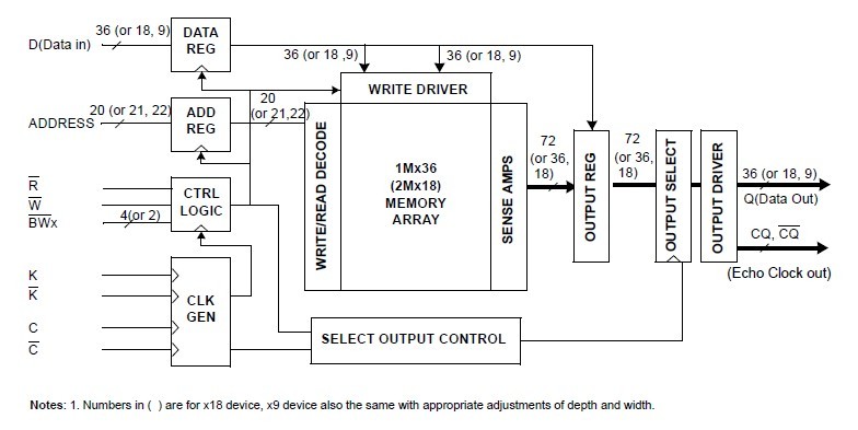 Features: (1)1.8V+0.1V/-0.1V Power Supply.; (2)DLL circuitry for wide output data valid window and future; (3)freguency scaling.; (4)I/O Supply Voltage 1.5V+0.1V/-0.1V for 1.5V I/O,1.8V+0.1V/-0.1V for 1.8V I/O.; (5)Separate independent read and write data ports with concurrent read and write operation; (6)HSTL I/O; (7)Full data coherency, providing most current data ; (8)Synchronous pipeline read with self timed early write; (9)Registered address, control and data input/output; (10)DDR(Double Data Rate) Interface on read and write ports; (11)Fixed 2-bit burst for both read and write operation; (12)Clock-stop supports to reduce current; (13)Two input clocks(K and K) for accurate DDR timing at clock; (14)rising edges only; (15)Two input clocks for output data(C and C) to minimize clock-skew and flight-time mismatches; (16)Two echo clocks (CQ and CQ) to enhance output data traceability; (17)Single address bus; (18)Byte write function; (19)Sepatate read/write control pin(R and W).